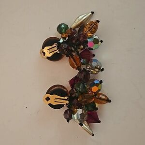 Colored Crystal Beads & AB Beads on Clip-on Earrings. These are old and have some wear on them as seen in photos. The gold long bead is plastic.
