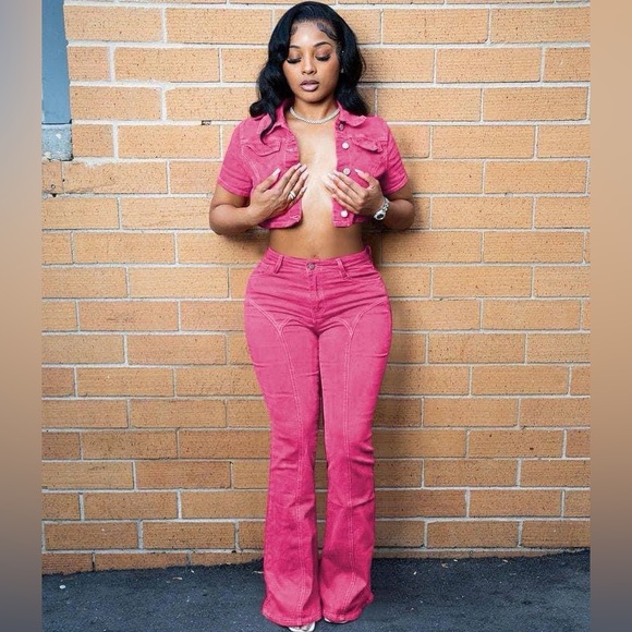 PINK DENIM PANTS AND CROPPED SHORT SLEEVE JACKET. Wide leg jeans, with stretch. Long in length. Runs true to size. Nice vibrant color.