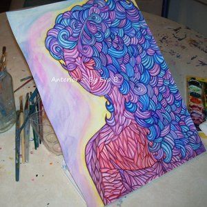 "Anterior". This vivid mixed media drawing features a lovely lady in abstract form. This brightly colored picture was made using colored pencil, ink, and watercolor paint. Colors include white , yellow, orange, red, raspberry, purple, blue, violet, aqua, black, and pink. Painting was done on 15 inch x 11 inch watercolor paper. Painting is unframed..**ALL ITEMS FROM PET FRIENDLY/SMOKE FREE ENVIRONMENT.**