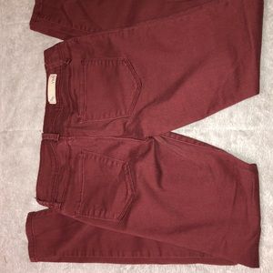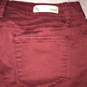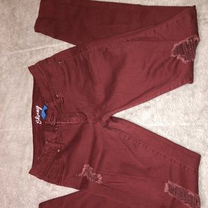 Burgundy color ripped jeans. Jeggings like material, very comfortable and stretchy.