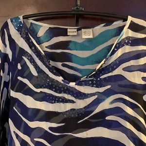 This top is very lightweight and to be worn with a camisole for the summer or as a cover for the beach. Also with embellishments.
