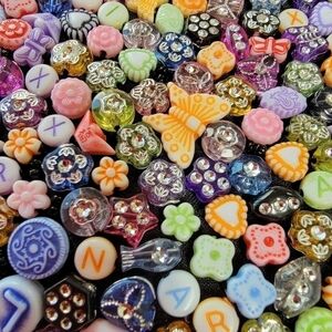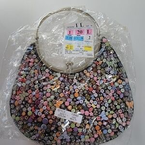 It's a super cute and fun purse! Small ~8"x10". Metal kiss clasp and handle. Front beaded with a variety of trinket beads in multicolors. Back is solid black. Handle has a small area of discoloration at base (see pics) on each side but doesn't impede function.