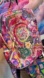Vibrant backpack with abstract patterns. Features a mix of pink, purple, and green colors. One of a kind piece that will turn heads.