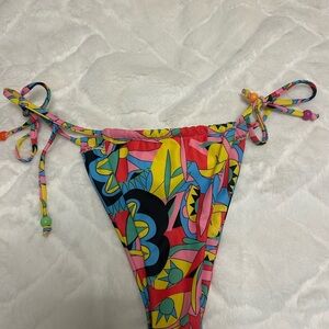 Vibrant bikini bottom with abstract patterns. Features pink, yellow, and blue colors. Adjustable side ties for a perfect fit.