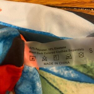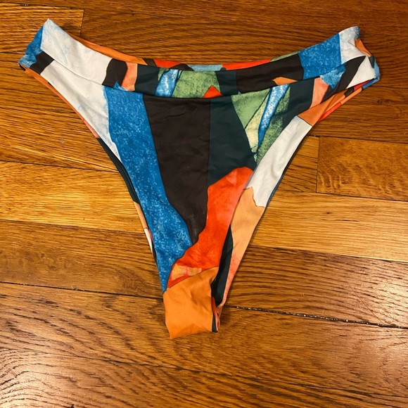 Vibrant bikini bottom with abstract design. Features shades of blue, orange, and black.