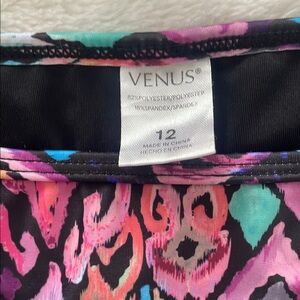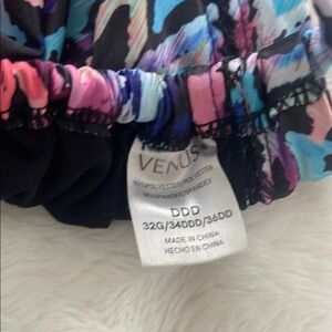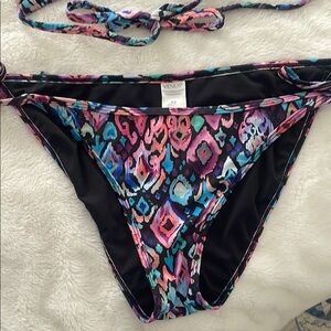 Vibrant bikini set with abstract patterns. Halter top with adjustable ties. Matching bottoms with side ties. Top size DD and bottom size 12. In good used