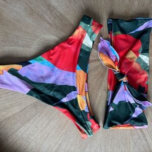 Vibrant bikini set with abstract patterns. Strapless top and high-cut bottoms. Perfect for a bold beach look.