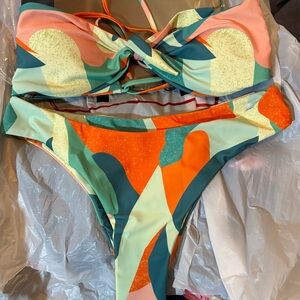 New without tags: Vibrant bikini set with abstract patterns. Features a mix of orange, green, and teal colors.