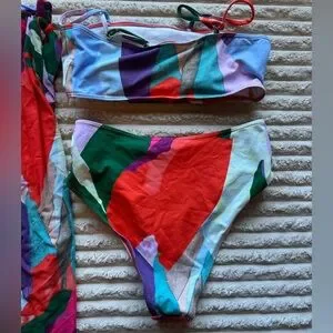 Vibrant bikini set with abstract patterns. Features a mix of red, green, purple, and pink colors.