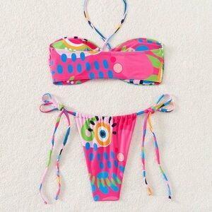 Vibrant bikini set with abstract design. Features pink, green, and blue patterns.
