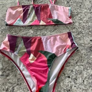 Vibrant bikini set with abstract patterns in pink, green, and red. Perfect for a stylish beach day.