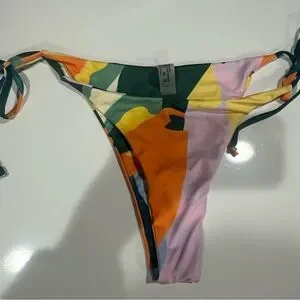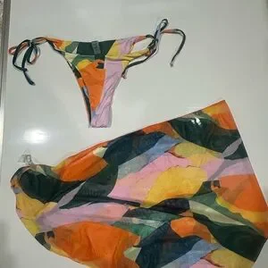 Vibrant bikini set with abstract patterns. Features a mix of colors including orange, pink, and green. Size large bottoms fits like a S/M with tie up skirt. No top.
