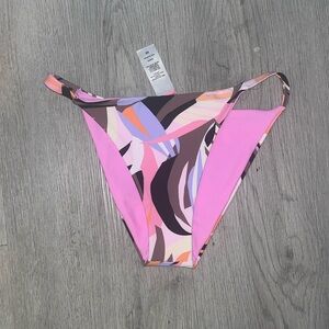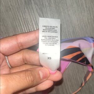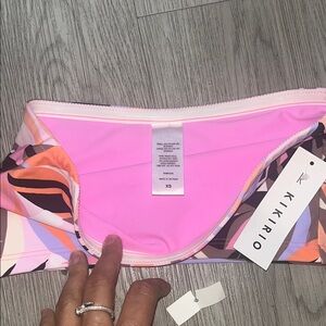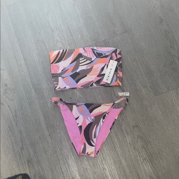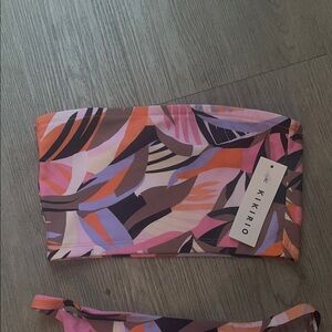 Vibrant bikini set with abstract patterns. Features a strapless top and matching bottoms. Perfect for a stylish beach day.