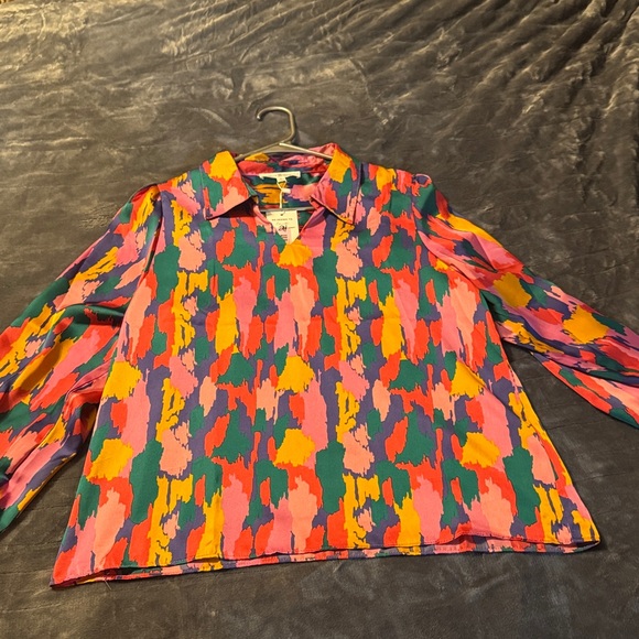 Vibrant blouse with abstract pattern. Features pink, orange, yellow, and green colors. NWT Michelle McDowell size large
