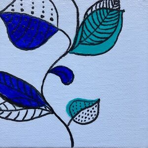 - Style/features: Colorful abstract acrylic painting in a layered leaf pattern with lots of playful movement and zendangles. Great for small spaces.