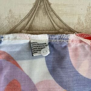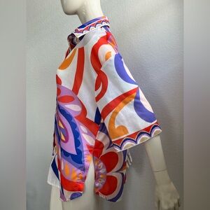 Vibrant button-up shirt with abstract patterns in red, purple, and orange. Features a unique design with a colorful palette.