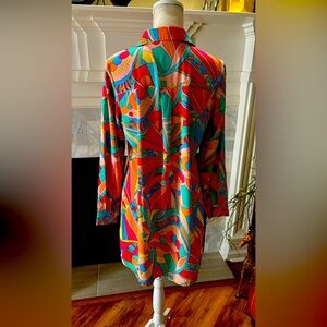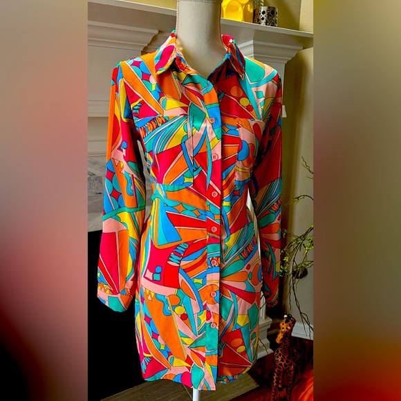 Vibrant button-up shirt with abstract patterns. Features a mix of bright colors for a bold look.
