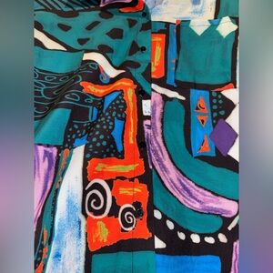 Vibrant button-up shirt with abstract patterns. Features teal, purple, red, and black colors. Oversized.