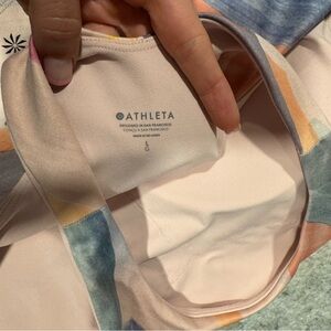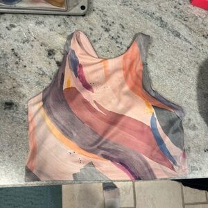 Vibrant crop top with abstract design. Features shades of pink, blue, and purple. Athleta conscious sports bra sz L. Pink splatter paint design and racer back . Worn a few times- has padding that’s removable .