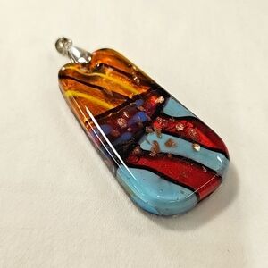 Colorful Abstract Design Fused Glass Pendant with 18K White Gold Plated Bail