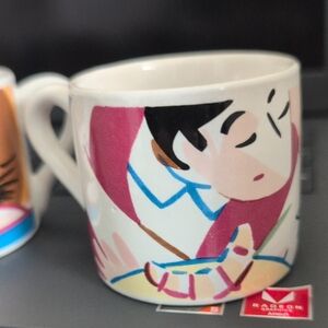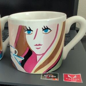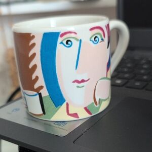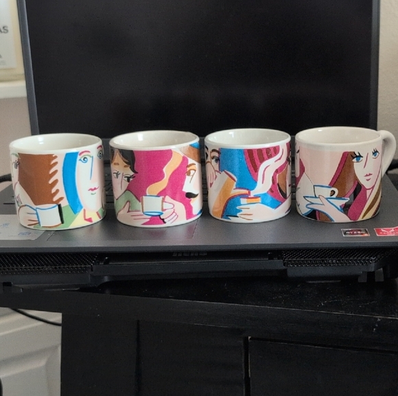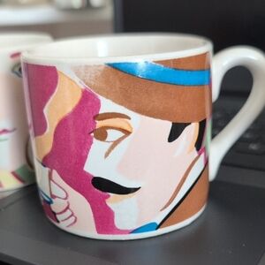 Set of four mugs with colorful fun abstract face designs. Features vibrant colors including blue, pink, and brown. these are collectible!
