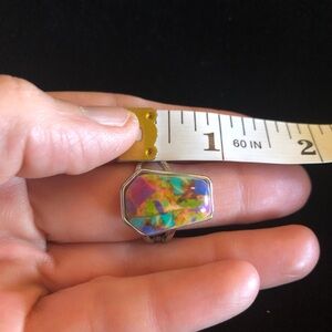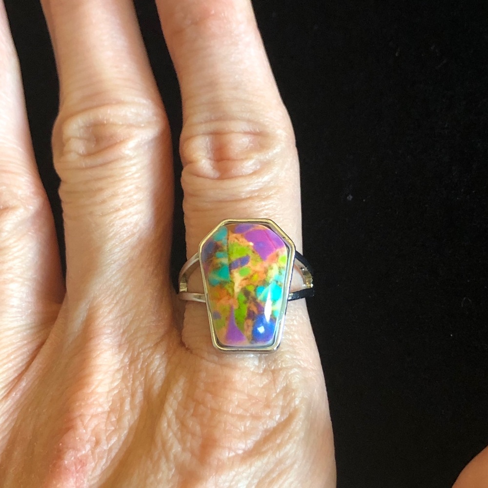 Add a splash of color to your outfit with this vibrant abstract geometric ring. Perfect for any occasion.