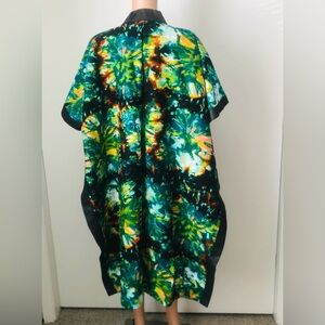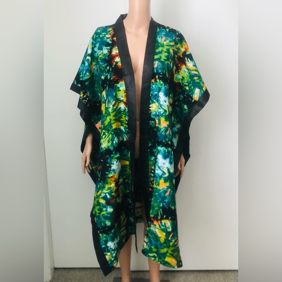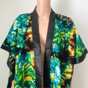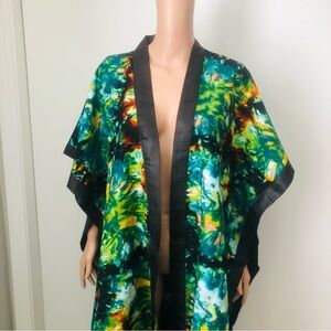 Eye-catching kimono with a colorful abstract pattern with the side slit down and the ends design with a black satin. Features vibrant shades of green, blue, and black. Perfect for any occasion