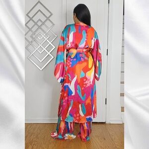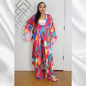 Vibrant kimono robe with abstract patterns. Features a mix of bright colors.