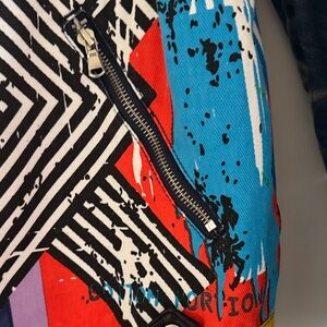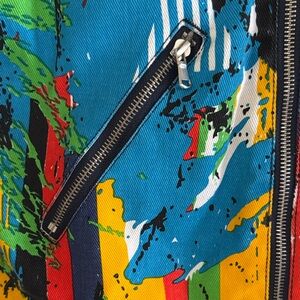 Vibrant leather jacket with abstract patterns. Features a mix of colors including blue, red, yellow, and black. Stylish and unique design.