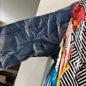 This is a Create 2 MRW men's distressed denim jacket featuring a multi-color graphic print and faux leather collar.