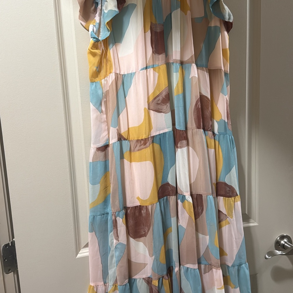 Vibrant maxi dress with abstract patterns. Features shades of blue, yellow, brown, and cream. Perfect for a stylish look.