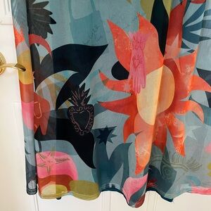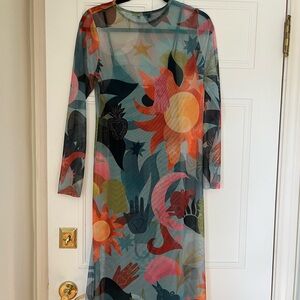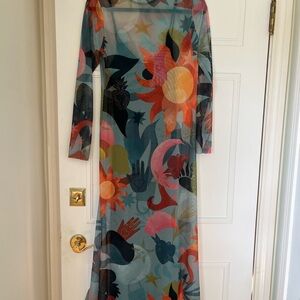 Worn once. Purchased this year for $160. One of a kind, Unique and Vibrant mesh maxi with abstract pattern. Features shades of blue, pink, orange, and black. Celestial and eclectic print.