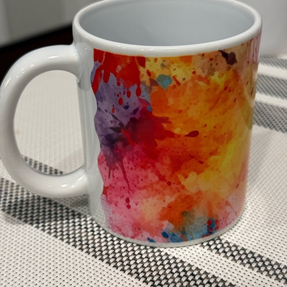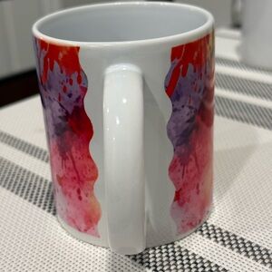Brighten your morning with this colorful abstract mug. Featuring a vibrant mix of red, purple, and pink splashes, it's perfect for adding a pop of color to your kitchen. Enjoy your favorite beverage in style. Dishwasher and microwave safe!