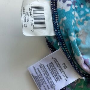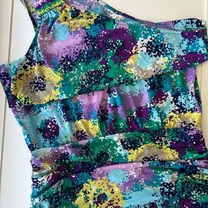 Vibrant one-shoulder tunic with an abstract pattern. Features shades of purple, green, yellow, and blue.