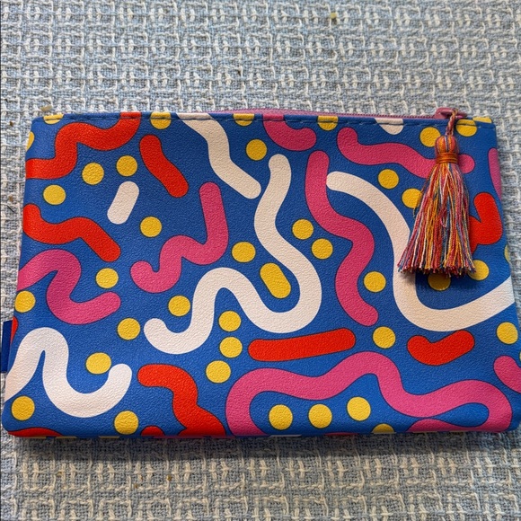 Vibrant clutch with abstract patterns. Features blue, pink, red, yellow, and white colors. Includes a multicolored tassel.