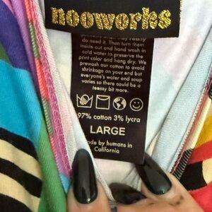 NOOWORKS VACATION DRESS! Vibrant dress with an abstract pattern. Features a mix of colors including pink, blue, green, and yellow. Perfect for a bold statement look.