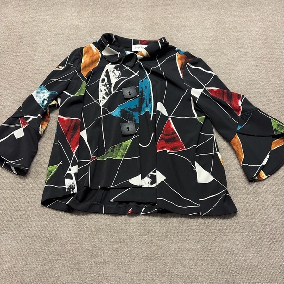 Statement Joseph Ribkoff swing jacket featuring a modern abstract multicolor print on a black base. Designed with dramatic bell sleeves, large square buttons, and a structured collar neckline for a bold, artistic look. Made in Canada with high-quality craftsmanship — a perfect piece for dressy occasions or upscale everyday wear.