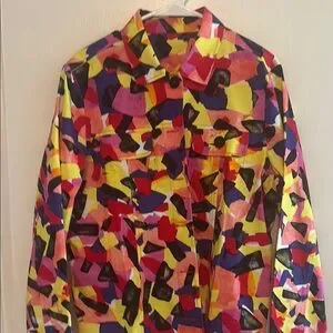Vibrant jacket with an abstract pattern. Features a mix of red, pink, yellow, and blue colors. Perfect for a bold fashion statement.