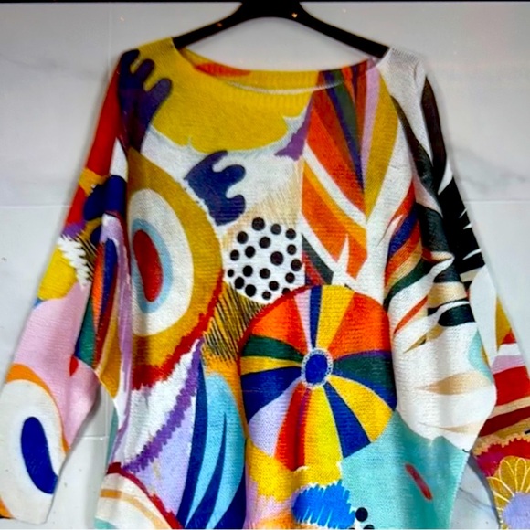 New! Vibrant lightweight knit sweater with a colorful abstract pattern. Features a mix of colors including yellow, red, blue, and black.