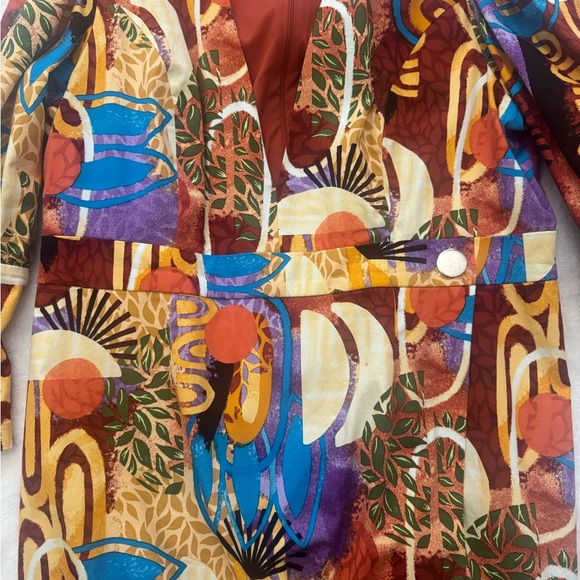 Vibrant dress with an abstract pattern. Features a mix of red, blue, yellow, and brown colors. Perfect for a bold fashion statement. It’s a size 3x but fits like a 2xl