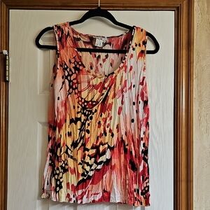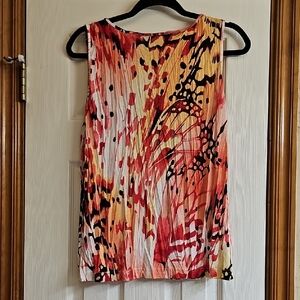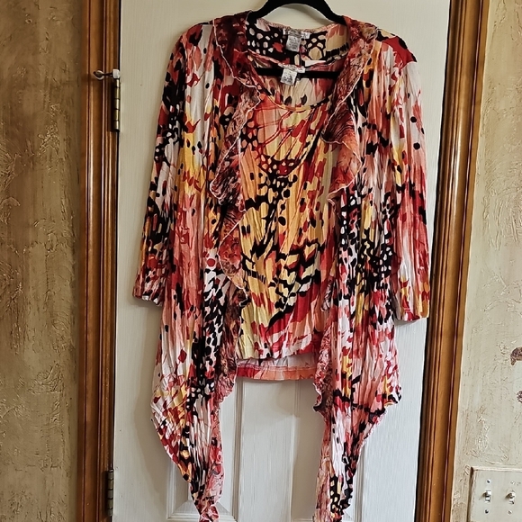 Vibrant cardigan and sleeveless top with an abstract pattern. Features a mix of red, black, and cream colors. Perfect set for adding a pop of color to any outfit.