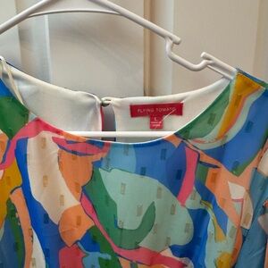 Vibrant dress with an abstract pattern. Features a mix of blue, pink, orange, and green colors. Never worn