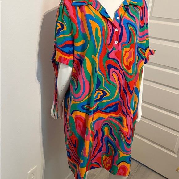 Vibrant dress with an abstract pattern. Features a mix of green, pink, orange, and blue colors. Perfect for a bold fashion statement.