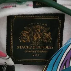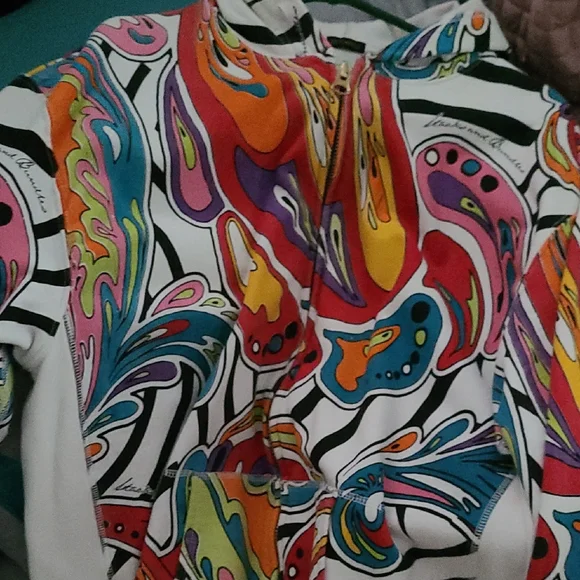 Vibrant jacket with an abstract pattern. Features a mix of colors including red, purple, and blue.