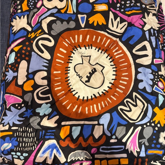 Vibrant scarf with abstract designs. Features bold colors and unique shapes. Perfect for adding a pop of color.