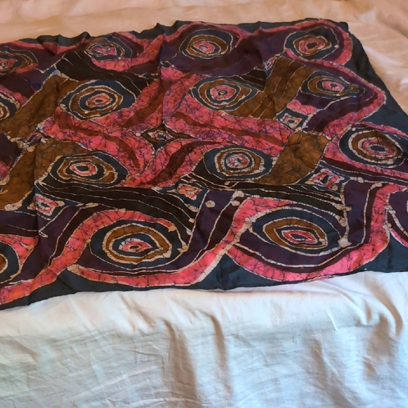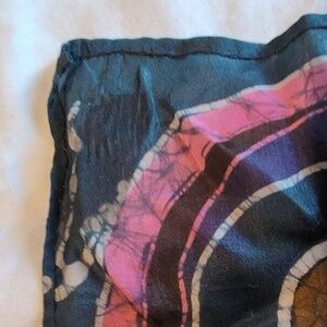 Vibrant silk vintage scarf with abstract patterns. Batik print.Features pink, brown, and blur colors. Perfect for adding a pop of color to any outfit. some minor wear at corner as photographed. approximately 33 inch square