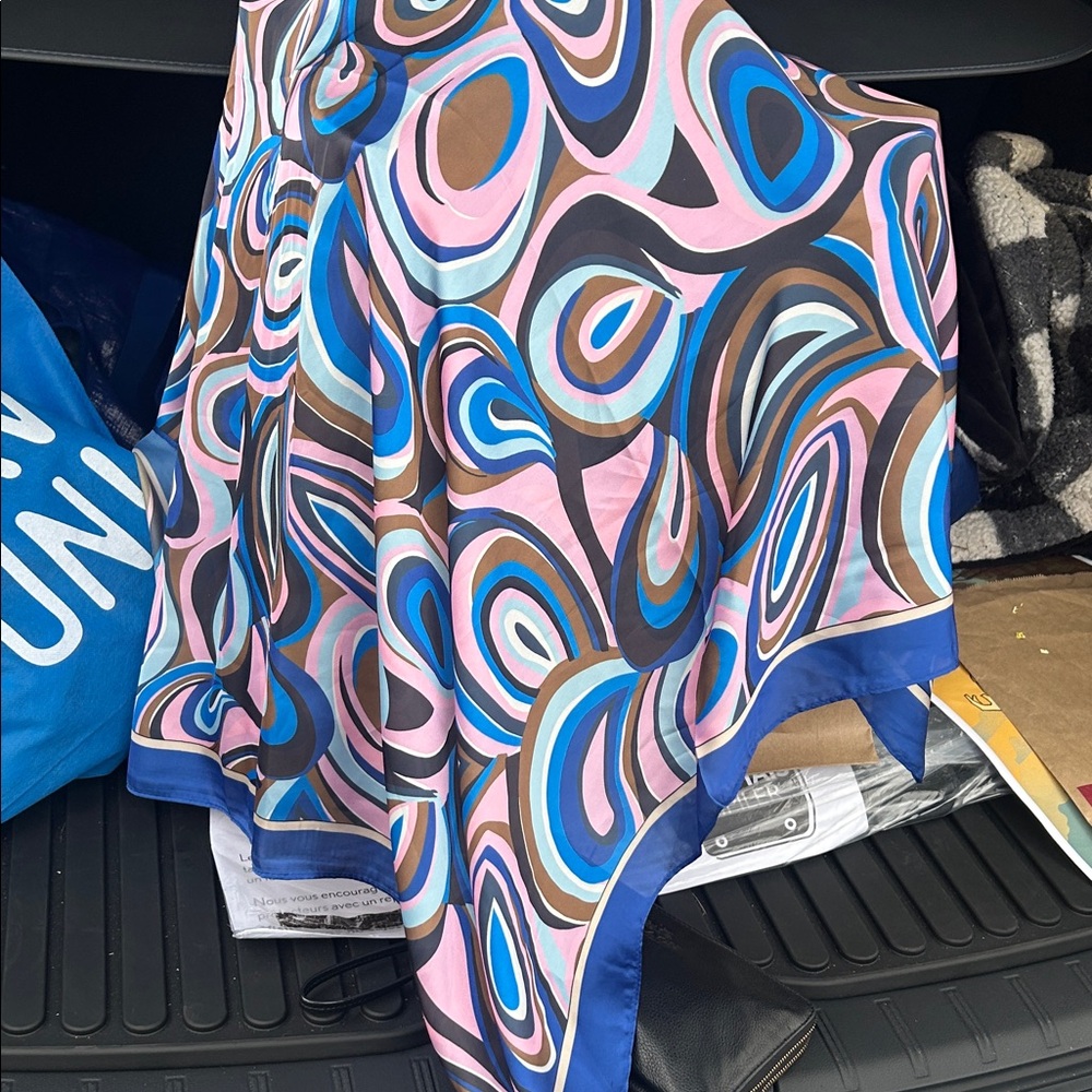 Vibrant scarf with abstract patterns in pink, blue, and brown. Perfect for adding a pop of color to any outfit.
