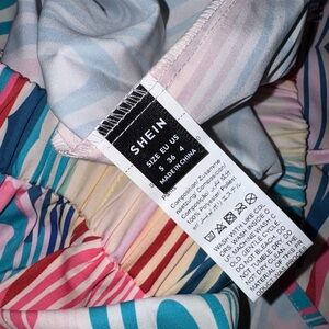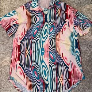 Vibrant two-piece set with an abstract pattern. Features a short-sleeve top and matching shorts. Perfect for a bold look.