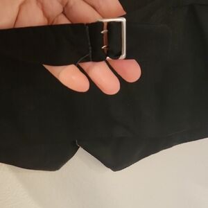 2 small front pockets, 4 buttons, adjustable belted back.
