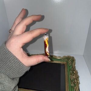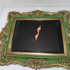 Rectangular pendant with abstract design. Features red, pink, and yellow swirls. Silver-tone frame and bail.